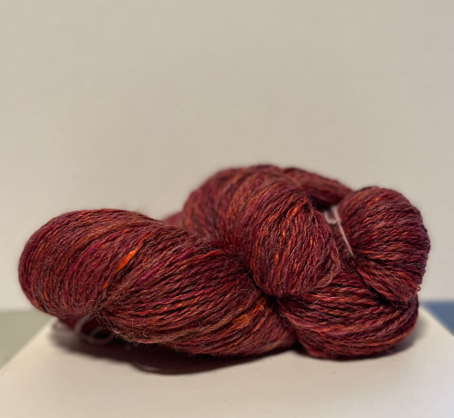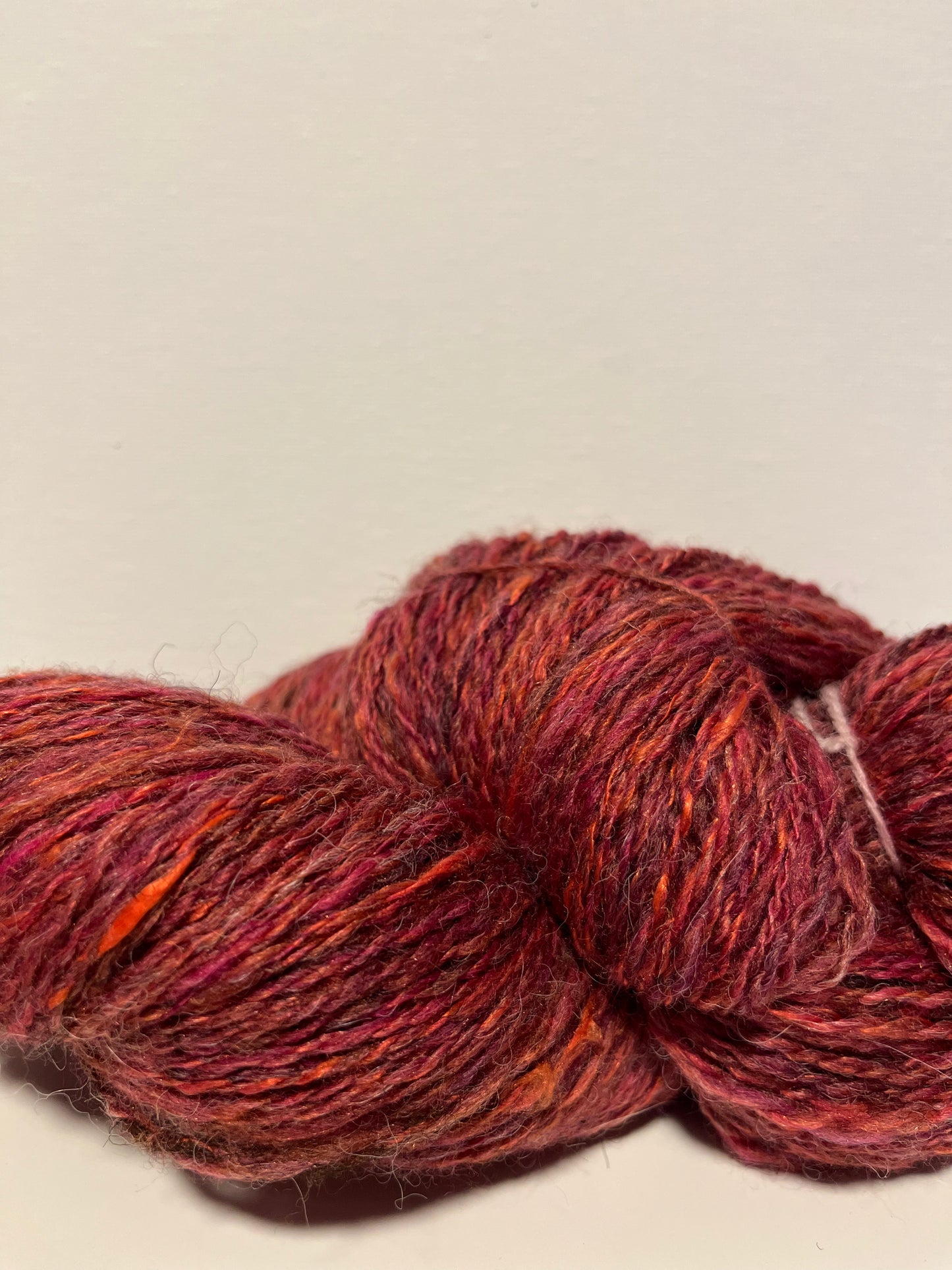 This yarn is spun on supported spindles and plied on my spinning wheel. The fibre was commercial top, hand dyed. I spun this fibre from the fold resulting in a warm, airy, woolenspun yarn.