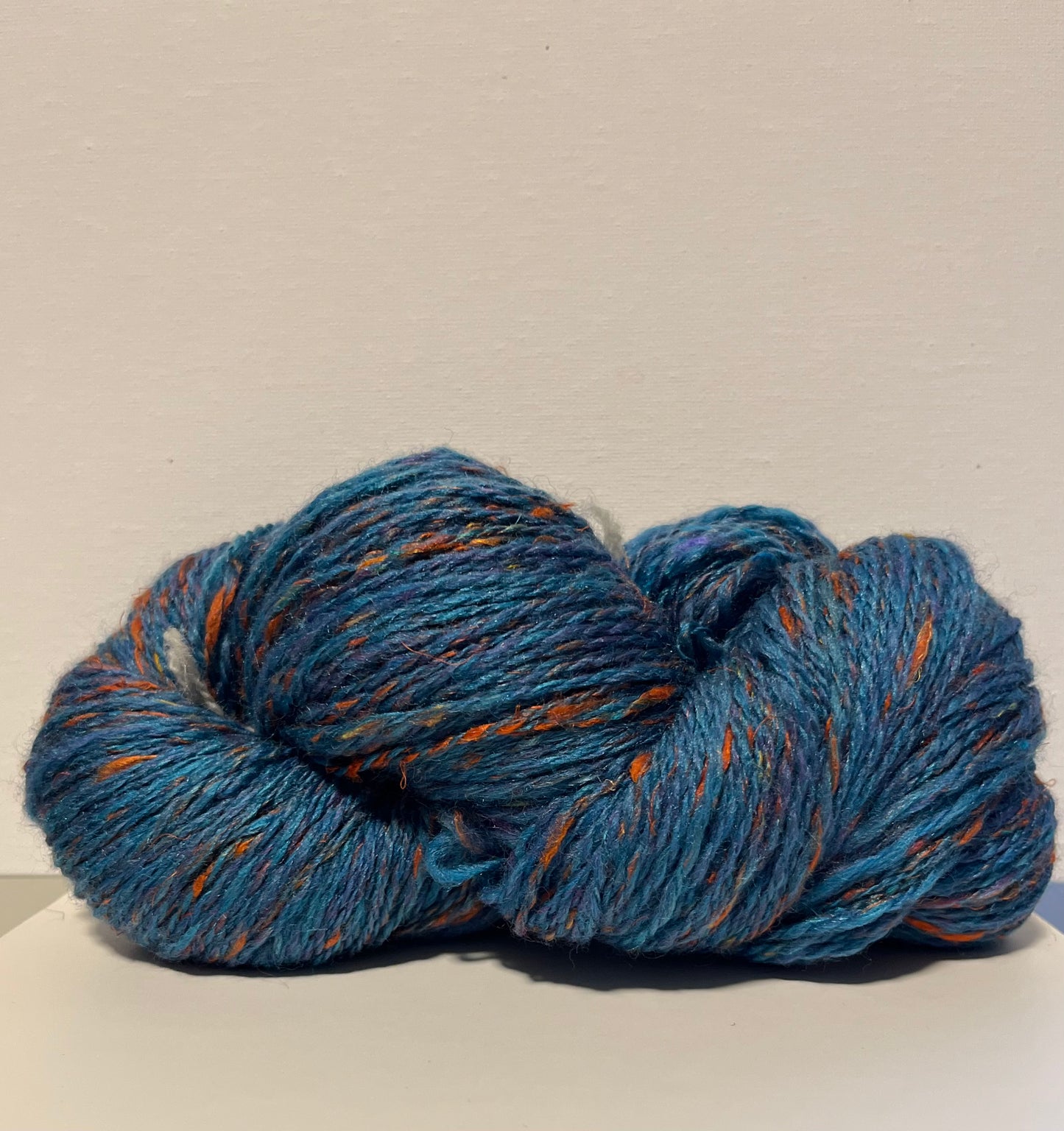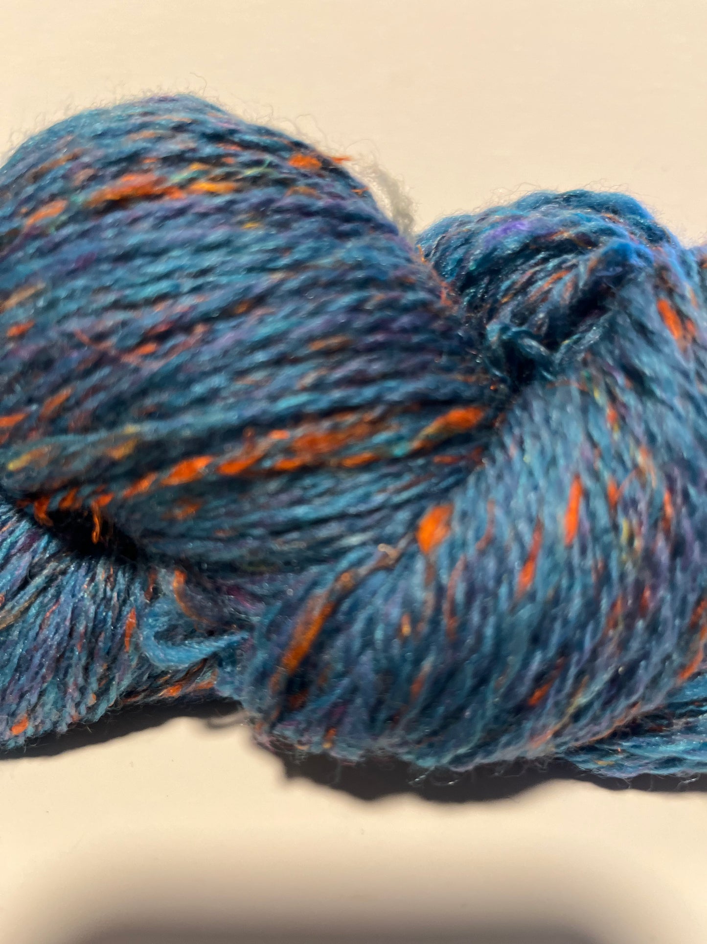 This yarn is spun on supported spindles and plied on my spinning wheel. The fibre was commercial top, hand dyed. I spun this fibre from the fold resulting in a warm, airy, woolen spun yarn.