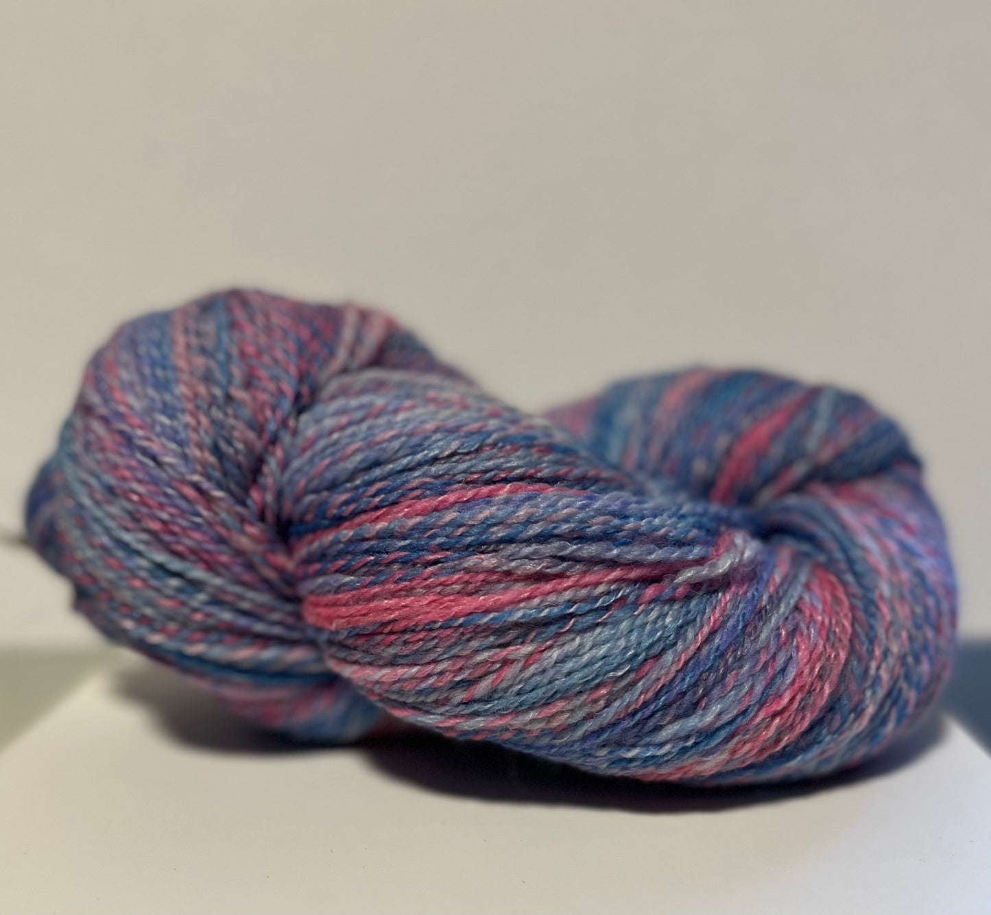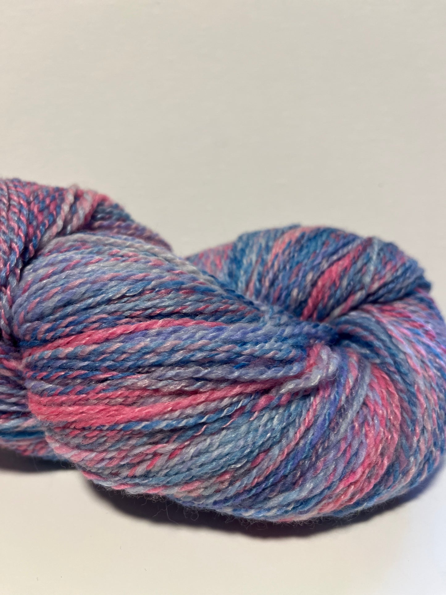 This yarn is spun on drop spindles and plied on my spinning wheel. The fibre was commercial top, hand dyed in pretty pink and blue shades. I spun this fibre worsted resulting in a smooth, drapey yarn.