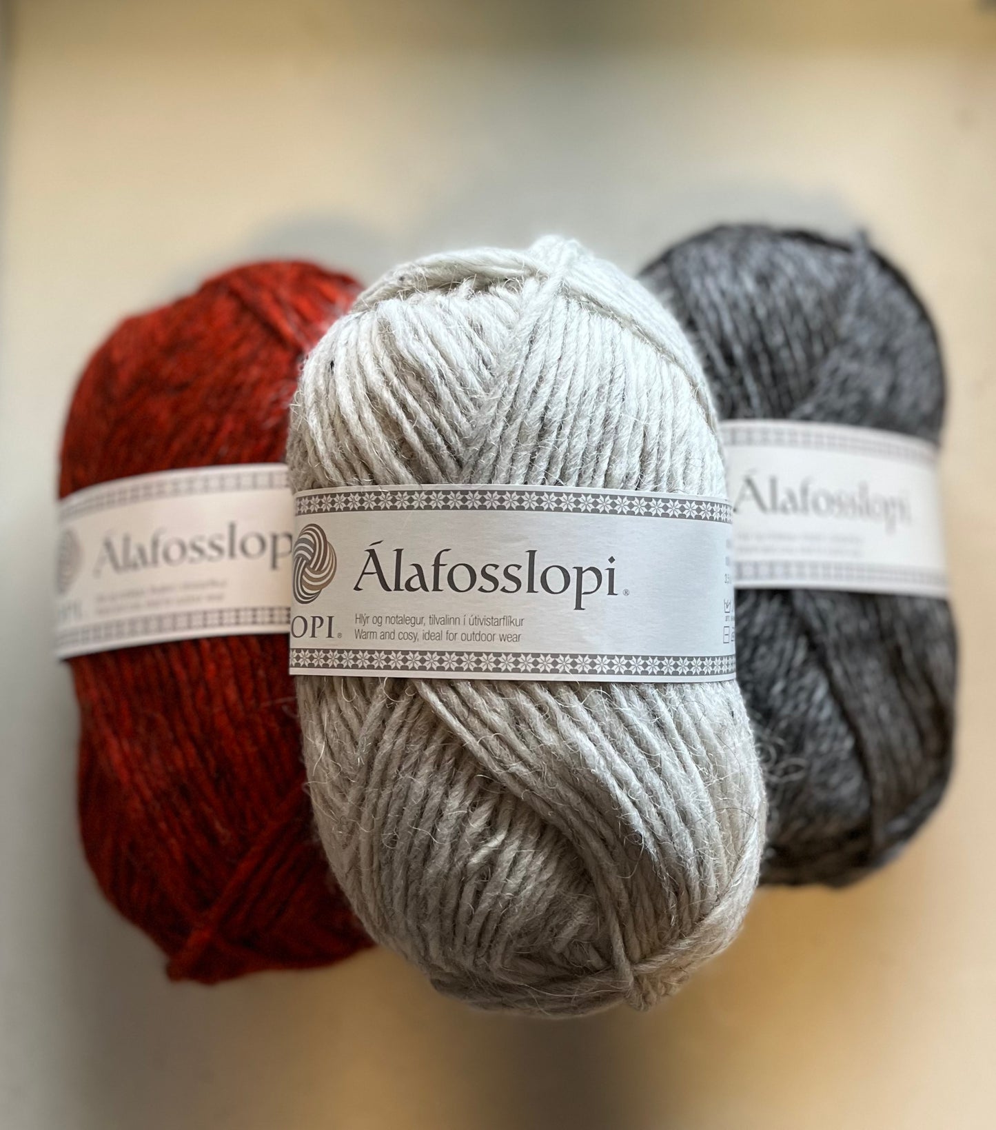 Alafosslopi is a heavier yarn from Istex. This Icelandic wool yarn is spun with two different fibers - the shorter, soft undercoat and the longer, coarser outer coat. This unique composition produces a yarn that is warming while also breathable. The finished garments will be light and wonderfully cozy. When you want a pretty garment that resists the Nordic cold, the words to remember are Alafosslopi yarn.